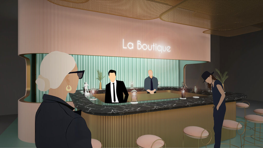 A celebration of the senses through shifting layers of luxury. Objects appear in measured motion -perfume, champagne, caviar- each moment a new sensory encounter. The space flows like a living installation, where architecture and experience blur into one continuous indulgence.