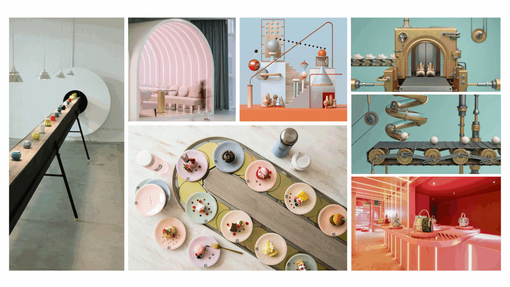 All the luxury objects move before visitors’ eyes on a sushi‑style conveyor, turning the display into an immersive ritual that blends spectacle, hospitality, and spatial storytelling.