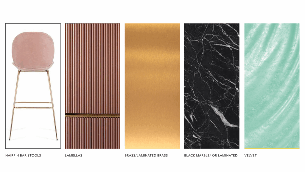 Brass, black marble, velvet. Warm metal, dark stone, soft texture. Minimal, refined, spatially defined.
