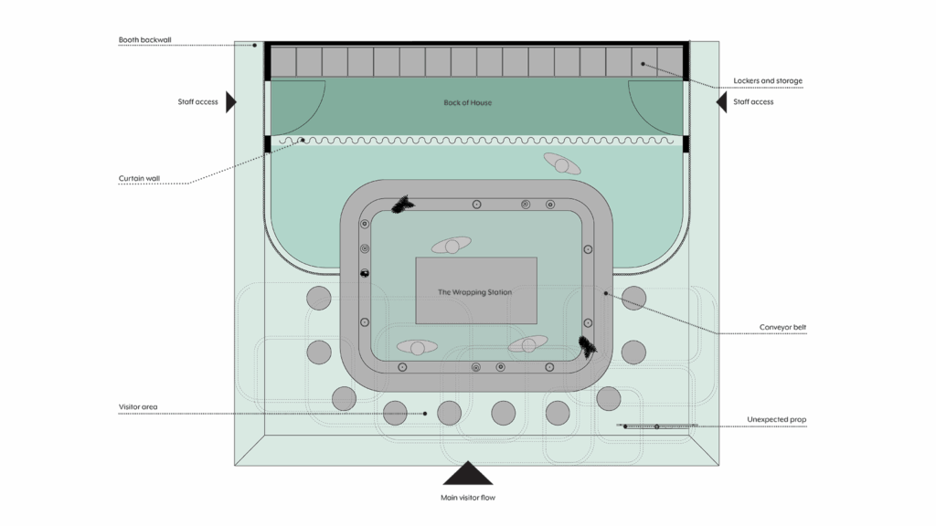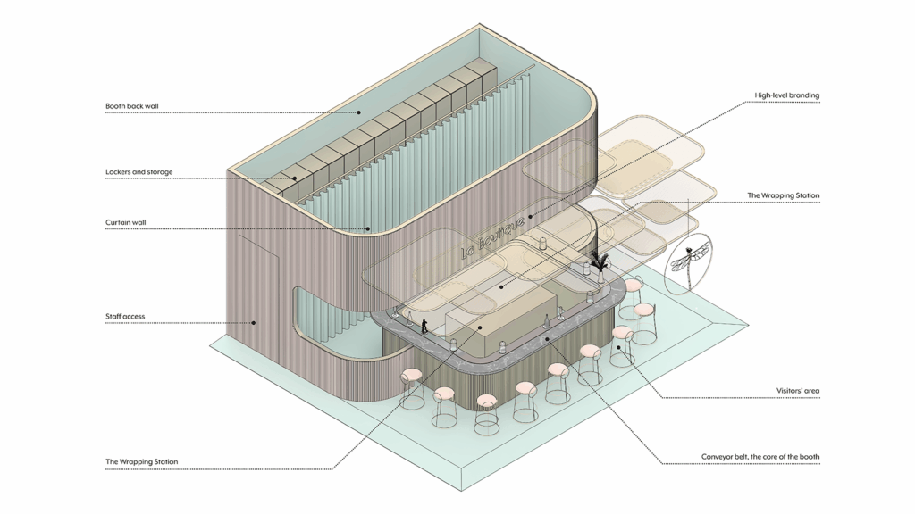 The installation is conceived as a spatial loop defined by flow and precision. A continuous counter anchors the plan, while the moving display organizes circulation and sightlines. Vertical lamellas and soft boundaries shape enclosure without mass.