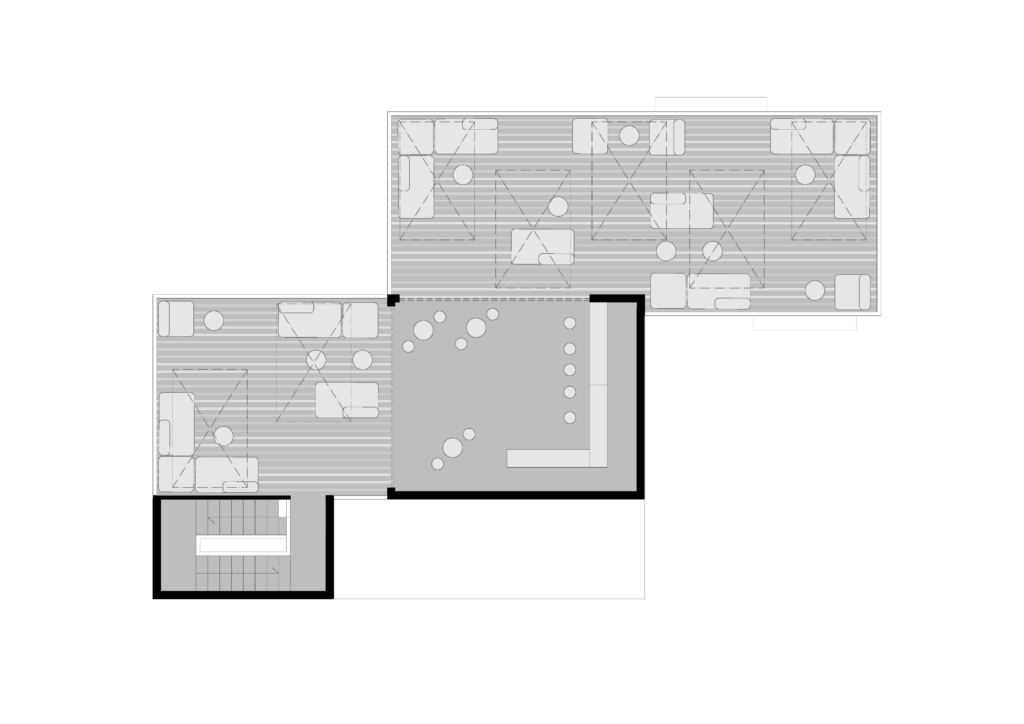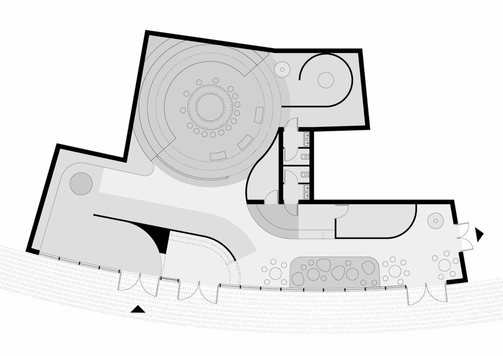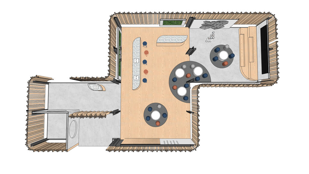The floorplan is a fluid sequence of experiential pockets, each framing a distinct moment of interaction within a continuous spatial flow.