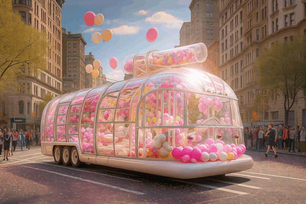The sweetest attack in the world is a delicious, playful, colorful, mesmerizing, sparkling tank made of sugar-butter-candy that rolls forward, overflowing with balloons, ice cream, and toys. This fantasy vehicle -the kind that only dreams give birth to- is an homage to everyone’s childhood. It speaks to the child within us all – even the most hardened, disconnected adults. It “invades” cities with laughter and sweetness, it storms the world with joy. It is a radiant call for people to awaken, to play, laugh, hug, connect. To love each other as fiercely as children love life. To rediscover wonder.